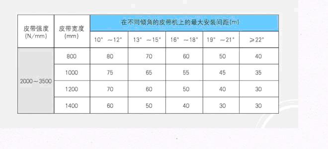 在不同傾角的皮帶機上的最大安裝間距(m)--(參考值)